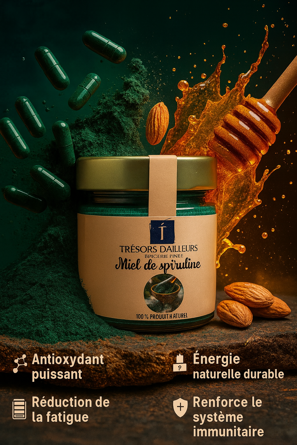 Ce subtil mélange fait partie de la gamme de miels audacieux de Trésors d’Ailleurs, alliant la douceur du miel pur aux vertus nutritives de la spiruline, reconnue comme l’un des meilleurs superaliments au monde 🌎.