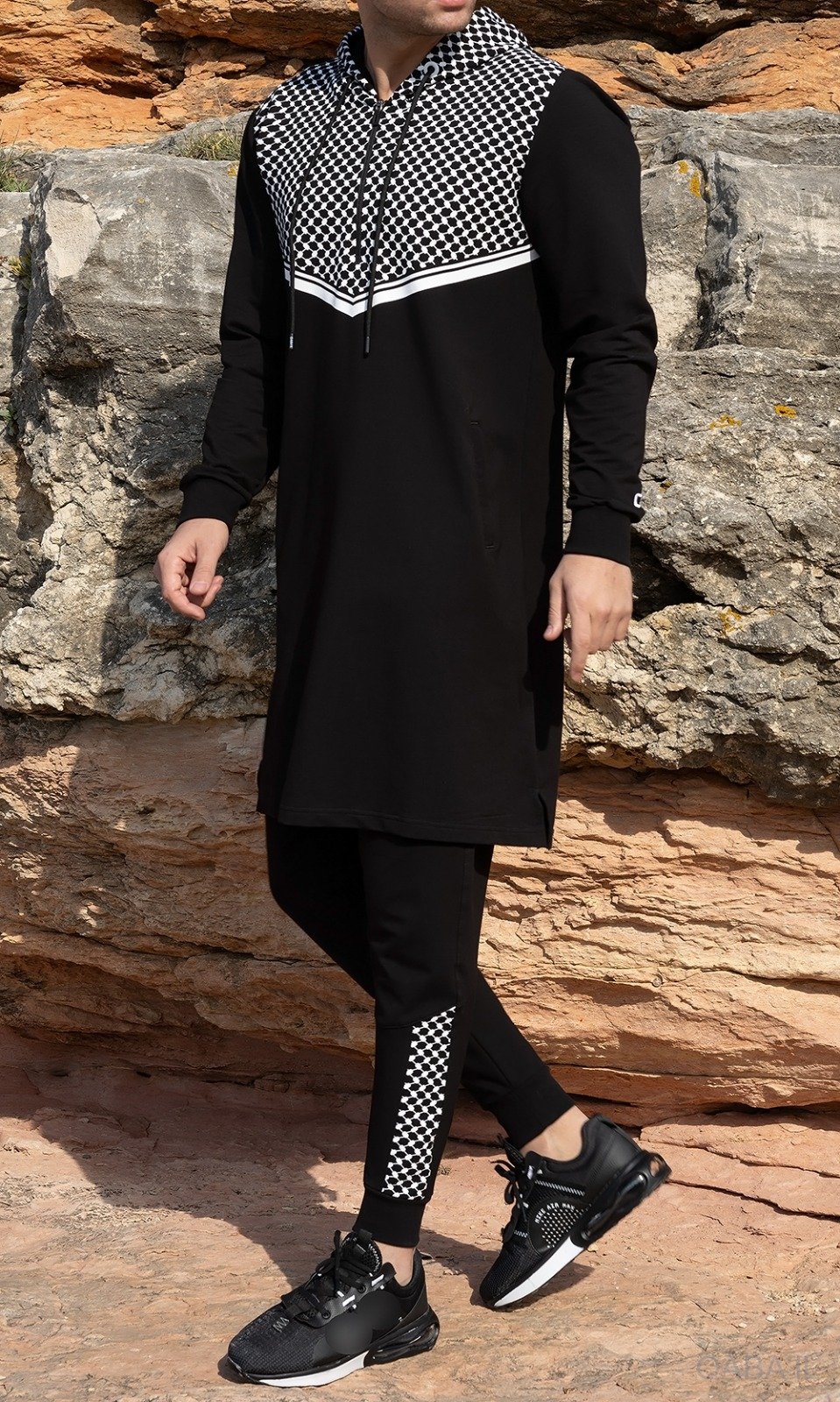 Cet ensemble comprend un qamis court noir avec un motif Keffieh imprimé blanc sur le torse et une capuche pratique, accompagné d’un sarouel semi-droit assorti, avec un rappel subtil du motif Keffieh sur les côtés.