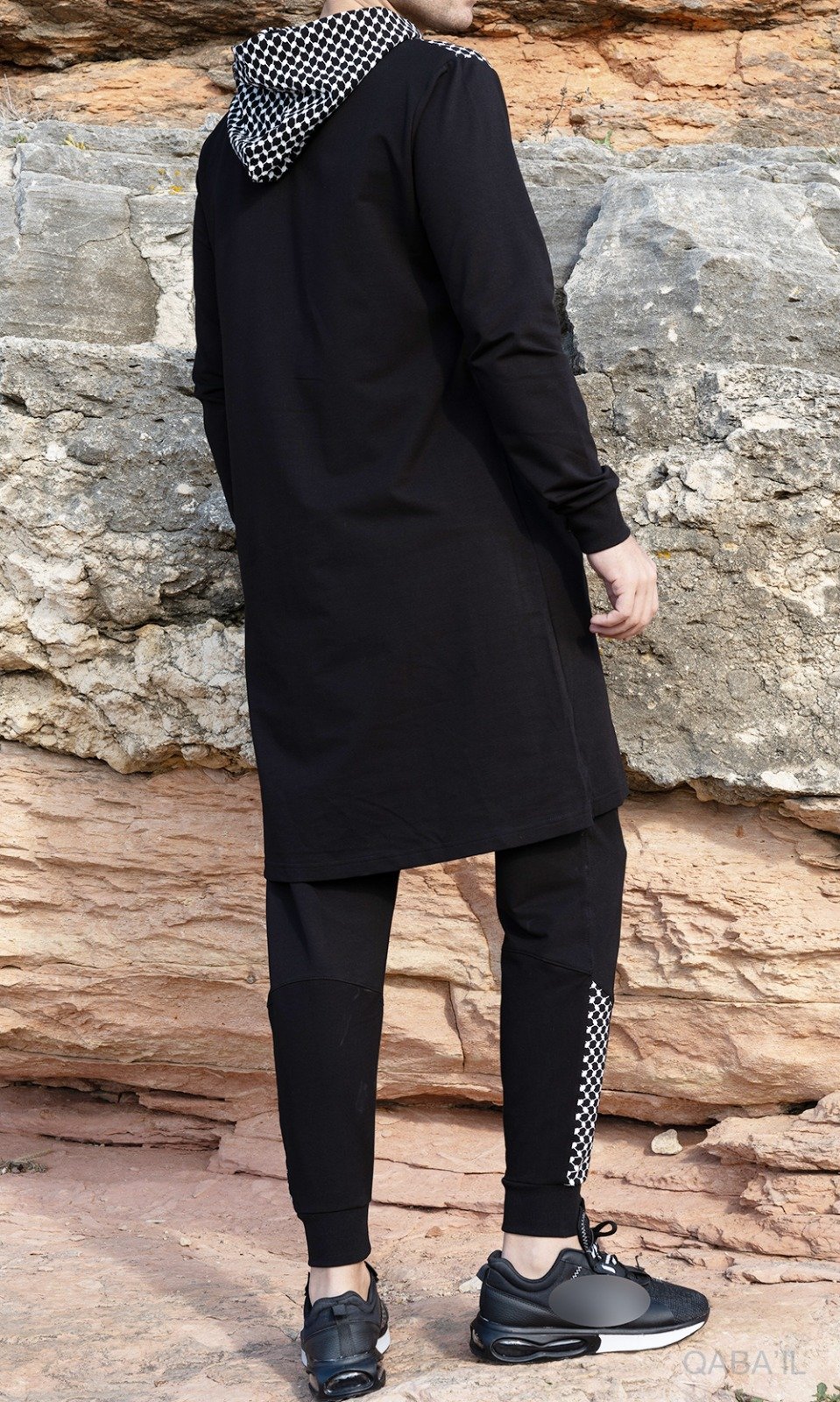 Ensemble Qamis Court Noir Impression Keffieh Blanc avec Capuche Qaba’il : QUDS