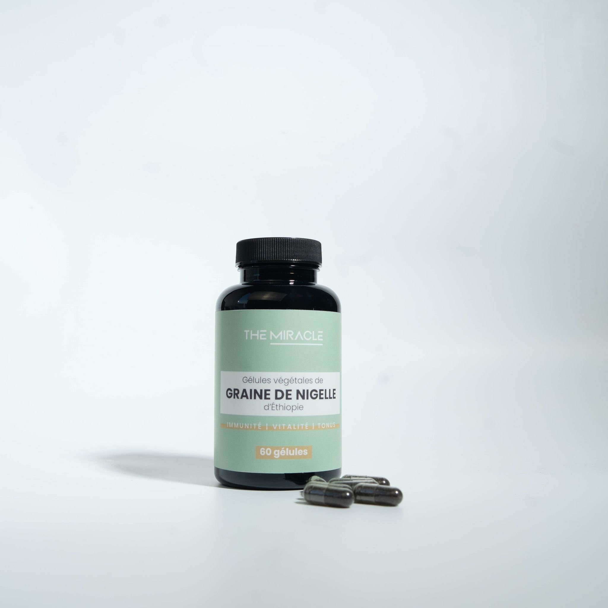 Gélules végétales à la graine de nigelle Habachiya* moulue. En complément alimentaire, Le conditionnement en gélules permet de bénéficier de toutes les vertus de la nigelle, sans son goût assez prononcé. *Graines de nigelle (nigella sativa) d’Éthiopie moulues certifiées pures à 99,9%. Gélules HPMC 100% végétales certifiées bio, halal, kosher et sans OGM.