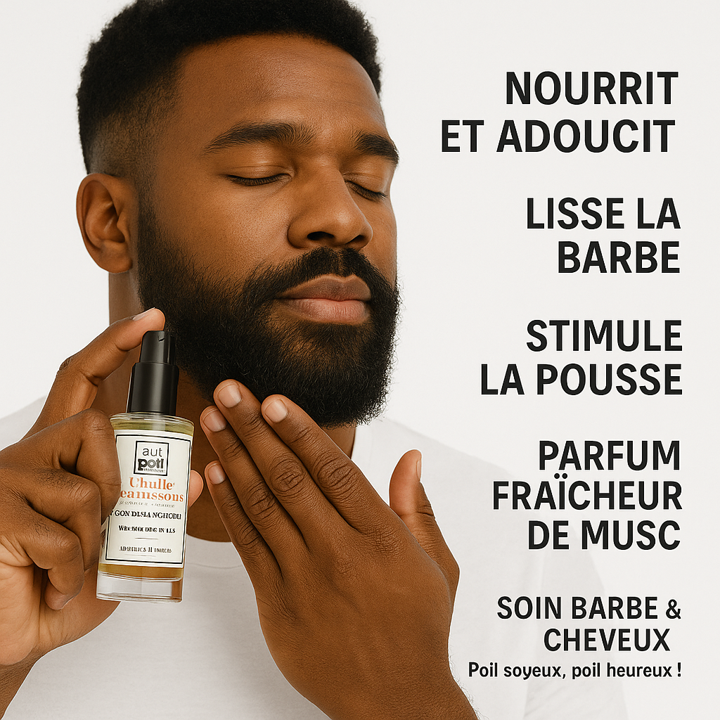 Découvrez l’huile nourrissante « Au Poil », formulée à 99,6% d’ingrédients d’origine naturelle, pour sublimer votre barbe et vos cheveux. Enrichie en actifs végétaux et parfumée à la fraîcheur de musc, cette huile hydrate en profondeur, adoucit les poils, stimule la pousse et laisse un fini doux et soigné. Idéale pour une routine soin au naturel, fabriquée en France, approuvée par Sébastien Chabal.