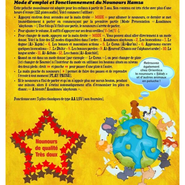 Modes d’écoute programmables : Possibilité de régler des sessions d’écoute de récitations coraniques selon des durées spécifiques (30 minutes, 60 minutes, etc.).