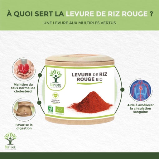 🌿🌳 UNE SOLUTION NATURELLE : La Levure de Riz Rouge est utilisée depuis des siècles par la médecine chinoise afin d’améliorer la digestion et la circulation sanguine. Plus récemment les scientifiques ont découvert que ce champignon microscopique avait un effet particulièrement puissant pour garder une bonne santé vasculaire. 👌💎 MONACOLINE K : La Levure de Riz Rouge contient en effet une statine naturelle : la Monacoline K, c’est elle qui maintient le niveau de mauvaises graisse dans le sang, le mauvais cholestérol. L’industrie pharmaceutique utilise des statines de synthèse pour fabriquer ses médicaments afin d’avoir les mêmes effets. Notre Levure Riz Rouge bio constitue donc une alternative efficace et naturelle. ✅📆 NOUVELLE REGLEMENTATION : Nous dosons nos gélules à 600mg de Levure de riz rouge. Soit 2,4mg de Monacoline k. Cette une nouvelle règlementation gouvernementale arrivée cette été. Vous ne trouverez plus de gélule de riz rouge avec + de 3mg par gélule et dose journalière. 🔼💊 HAUTEMENT DOSÉ : Notre Formule est pure et biologique ce qui lui procure un fort pouvoir d’assimilation. En plus d’être 100% naturel, notre produit contient 100% de poudre de levure par gélule et rien d’autre! Soit 600 mg par dose journalière recommandée. ⭐🔍 QUALITÉ FRANÇAISE = SECURITÉ : Nous fabriquons nos compléments alimentaires en France, nous avons fait le choix d’encapsuler notre levure de riz rouge bio en gélules végétales et non en comprimés pour ne pas intégrer de substances controversées tel que le talc, le stéarate ou le carbonate de magnésium. Nos produits sont garantis sans additifs, ni sucre, ni ogm, ni pesticides, ni gluten, ni lactose, ils sont contrôlés en France et certifiés agriculture biologique, HACCP + et Afnor. Qu’est-ce que c’est? La levure de riz rouge tient son nom d’un champignon microscopique qui est cultivé sur du riz. Ce sont les pigments de la levure qui sont rouge. Sa vertu principale est de maintenir le taux de mauvaises graisses et de lipides sanguins. Notre produit Bioptimal nutrition naturelle : Ingrédients, uniquement levure de riz rouge bio. Formule en gélule végétale, pour un régime adapté vegan. Dosage 600 mg / capsule. 1 gélules par jour, soit 600 mg. Boire avec un grand verre d’eau. Cure de 2 mois. Allégations liées : ● Contribue à maintenir un taux normal de cholestérol LDL à condition d’apporter 10 mg de monacoline K par jour – 1 gélule/jour