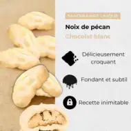 Noix de Pécan au chocolat blanc : l’équilibre idéal entre la légèreté du chocolat blanc et le croquant des noix.