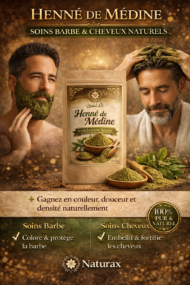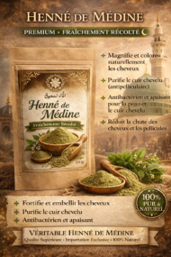Le henné de Médine est un soin naturel ancestral reconnu pour fortifier les cheveux, stimuler leur pousse et les colorer naturellement. Utilisé également pour la barbe et la peau, il purifie, renforce et apporte brillance et vitalité.