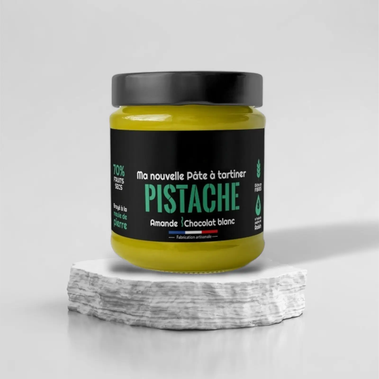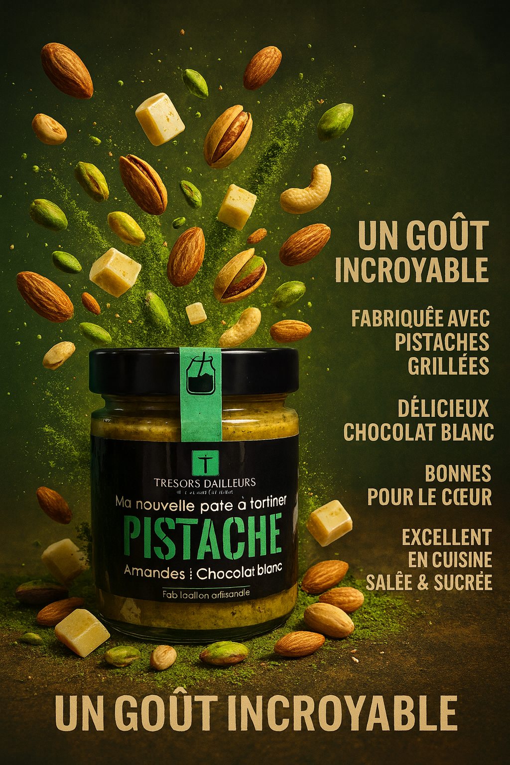 La pâte à tartiner à la pistache Trésors d’ailleurs est une délicieuse combinaison de saveurs riches et crémeuses. Préparée avec soin, elle offre une expérience gustative unique pour les amateurs de pistache. Chaque pot de 200g est rempli d’une texture lisse et onctueuse qui se marie parfaitement avec différentes préparations culinaires ou simplement l’étalée sur du pain frais.