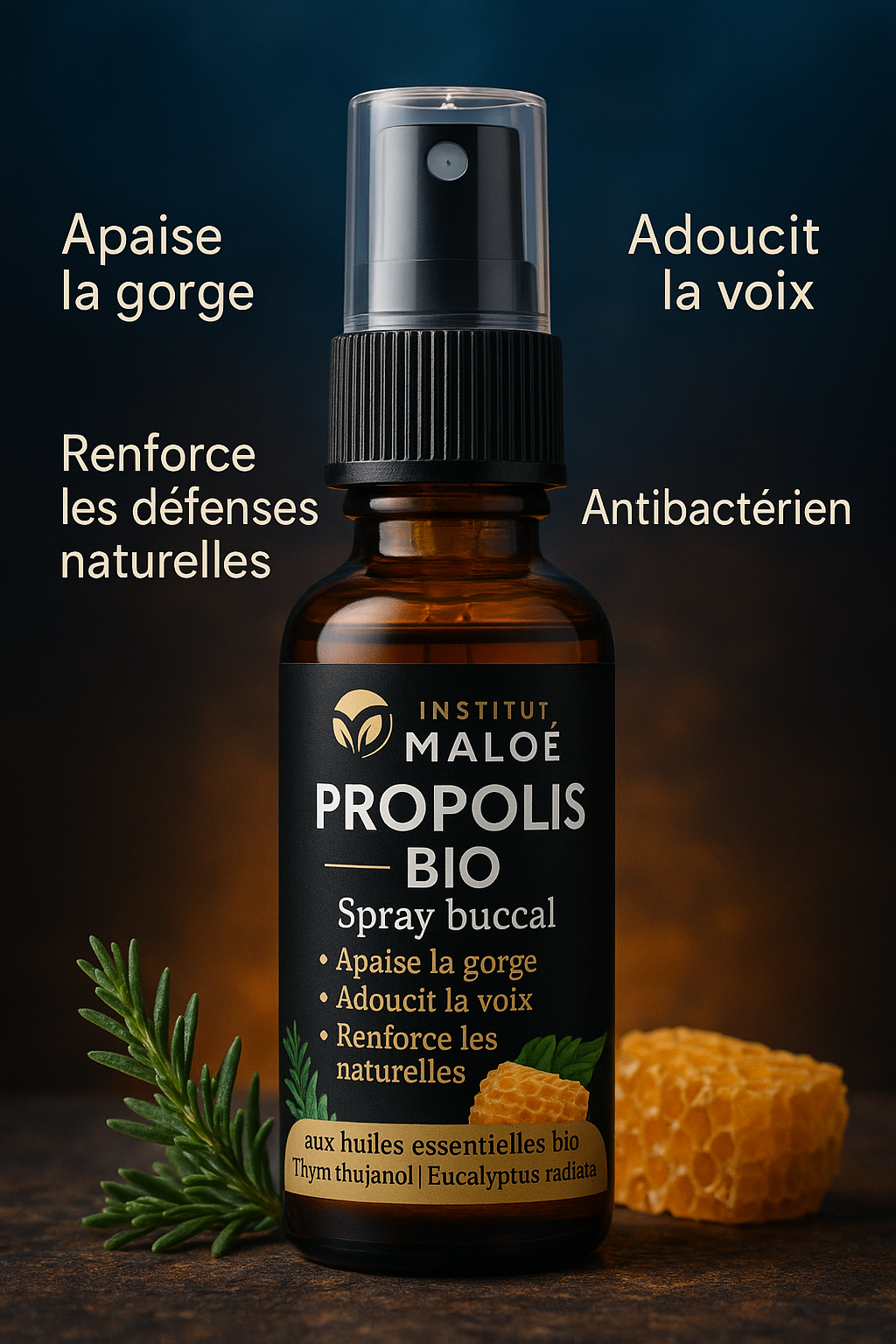 Découvrez le spray buccal à la Propolis BIO de l’Institut Maloé, un concentré naturel aux huiles essentielles bio de thym et d’eucalyptus. Idéal pour apaiser les irritations de la gorge, adoucir la voix et renforcer les défenses immunitaires. Grâce à ses propriétés antibactériennes et anti-inflammatoires, ce spray est un allié précieux en cas de maux de gorge, en période hivernale ou lors d’un affaiblissement passager. Facile à utiliser au quotidien, il offre un soulagement rapide et durable, 100 % naturel.