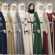 Ensemble Abaya Cardigan 3 pièces composé d’une robe intérieure, d’un cardigan fluide et d’une ceinture assortie. Élégant, confortable et disponible en plusieurs coloris.