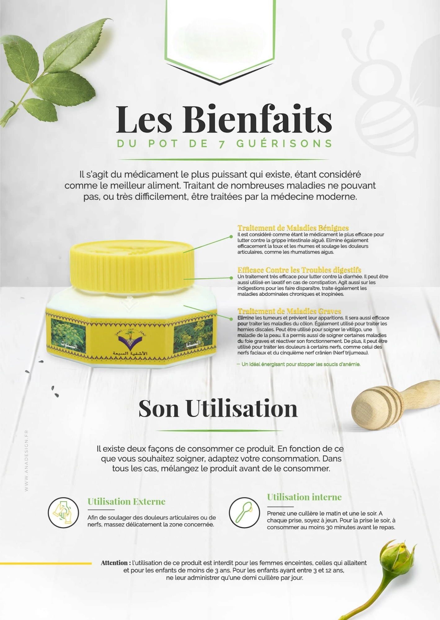 Le pot 7 guérisons, autrement appelé 7 ashfiah, ashfiah 7 ou الأشفية السبعة, est un mélange exceptionnel de plusieurs ingrédients et est notre meilleur produit Santé & Bien-être. Il a été effectué par le centre de recherche Saoudien situé dans la ville de Médine. Le dosage de chacun des produits a été calculé afin de permettre une action ciblée sur plusieurs points, de façon à optimiser son efficacité.